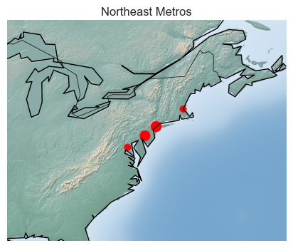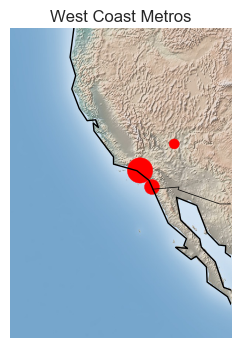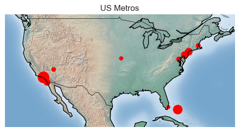 I did this by creating a basic function to look up the latitude and longitude for a list of values using geopy. I inserted the resulting lists back into the dataframe and then plotted populations of active cities.