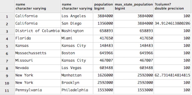 One query in this case study was employed to: “calculate the percentage size of the city relative to the city with the largest population in the state.”